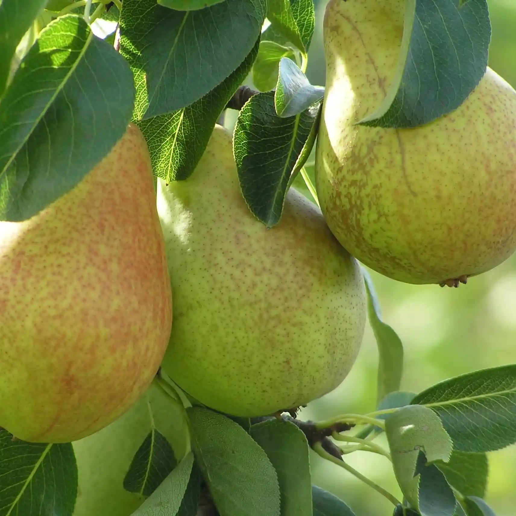 High quality cinnamon-brown russet color over green or yellow pear. Large long necked fruit with juicy spicy flavor. White melting flesh. Great fresh or canning.
